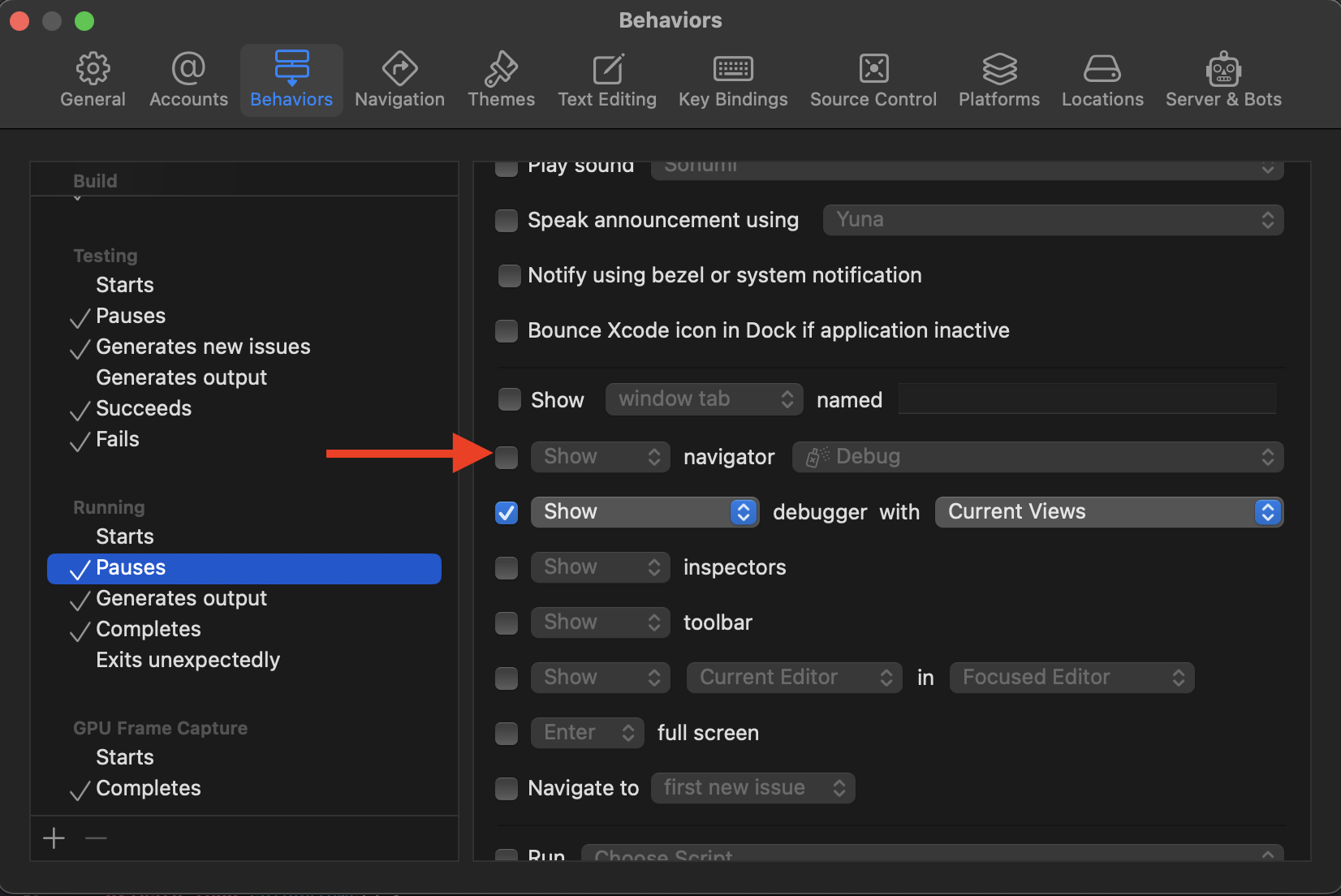 - Behaviors > 왼쪽 Running > Pauses > Show navigatior 옵션 체크 해제