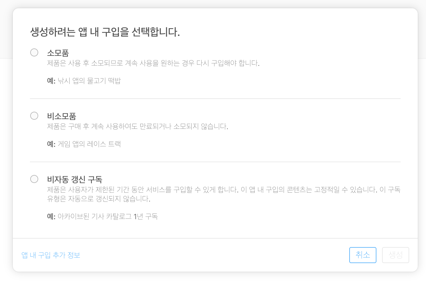 - App Store Connect -> 앱 내 구입 탭 선택 -> + 버튼 클릭