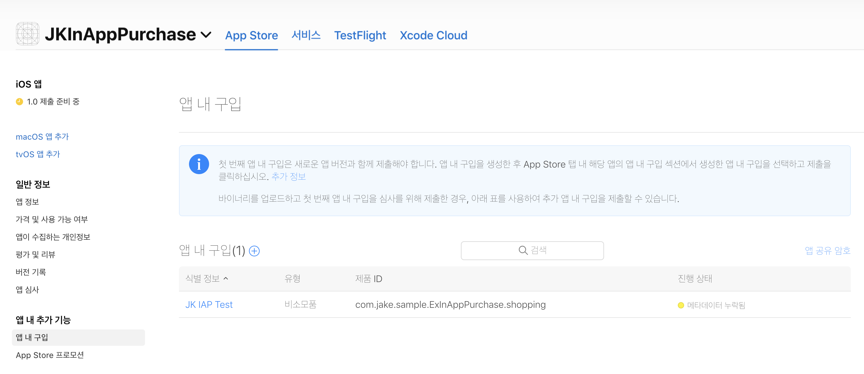 - App Store Connect > 앱 내 구입 > 상품 등록 완료