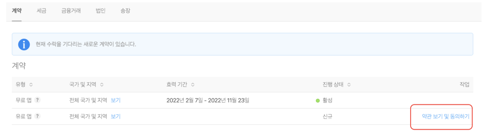 - App Store Connect > 계약, 세금 및 금융거래 > 유로 앱 > 약관 보기 및 동의하기 진행