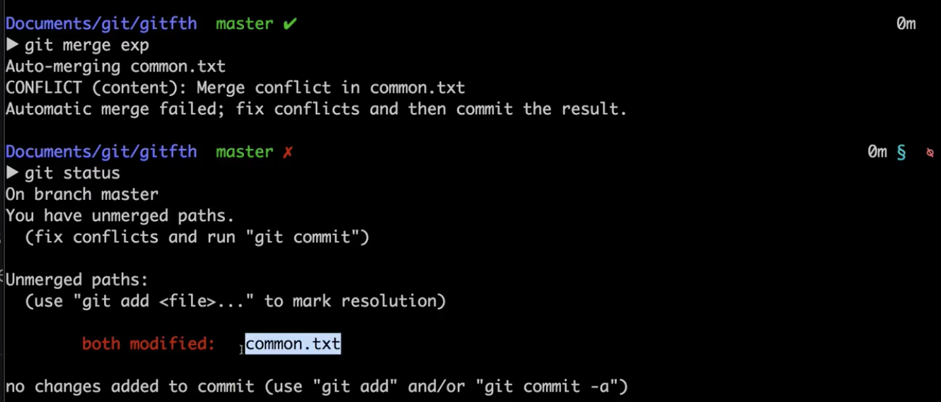 2) 병합된 두 브랜치 상에서, 같은 파일을 변경 후 각각 커밋 -> merge하면 어떤일 발생?