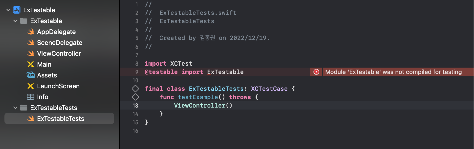 - ExTestableTests는 ViewController이 있는 모듈이 아니지만 @testable import ExTestable를 통해 사용