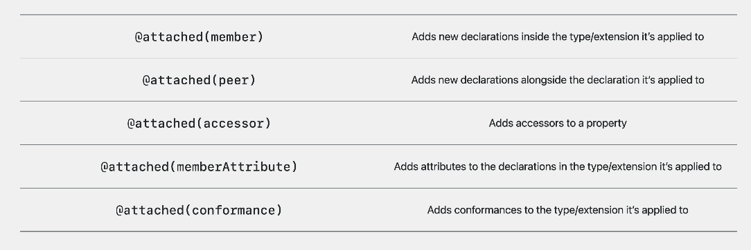 - attached(accessor): 접근자 매크로이며, property에 대한 특정 작업을 수행하는 것 (property wrapper와 비슷하지만 더 유연한 방식으로 추상화가 가능)