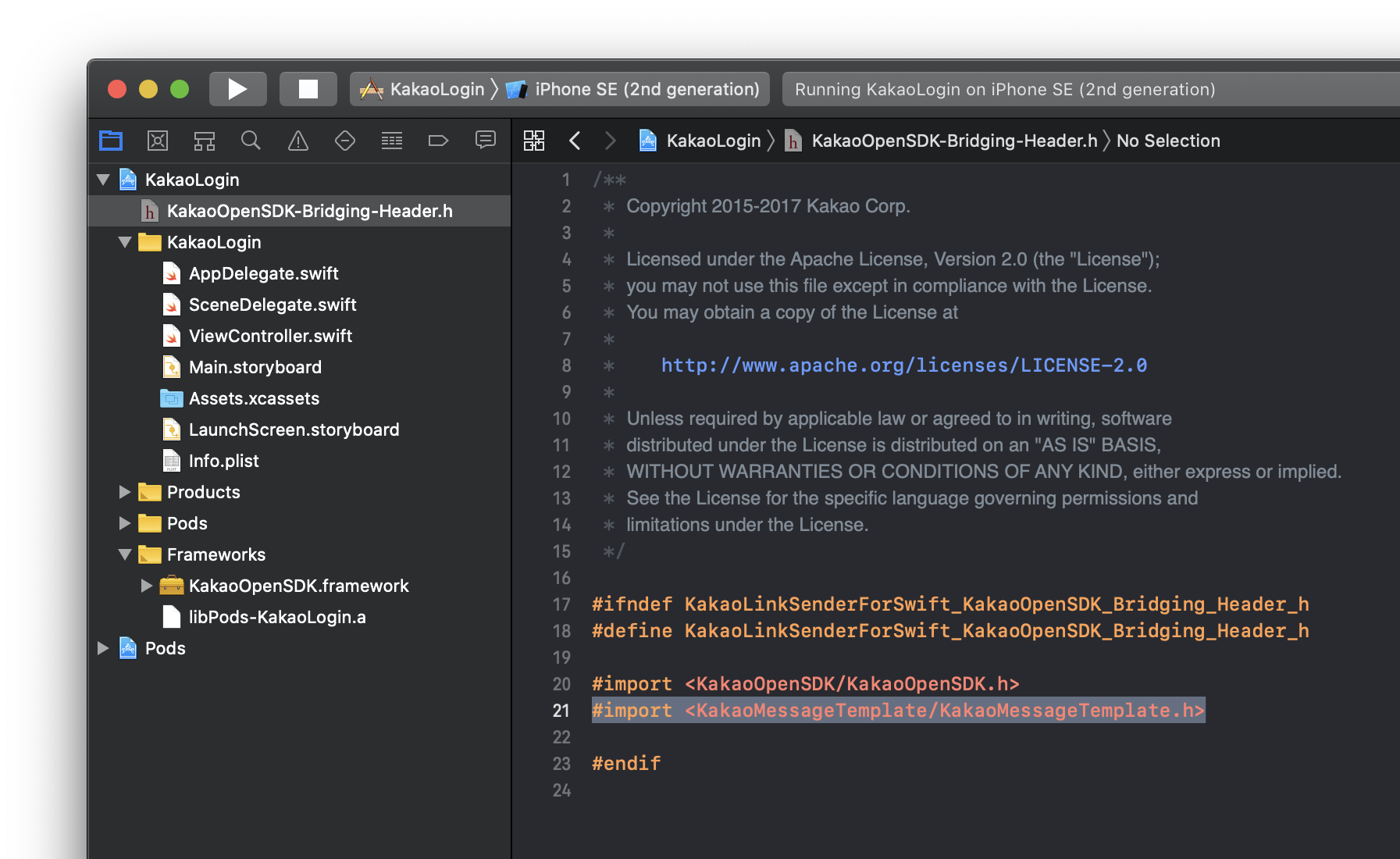 Objective-C Bridging Header에 "KakaoOpenSDK-Bridging-Hedaer.h"입력