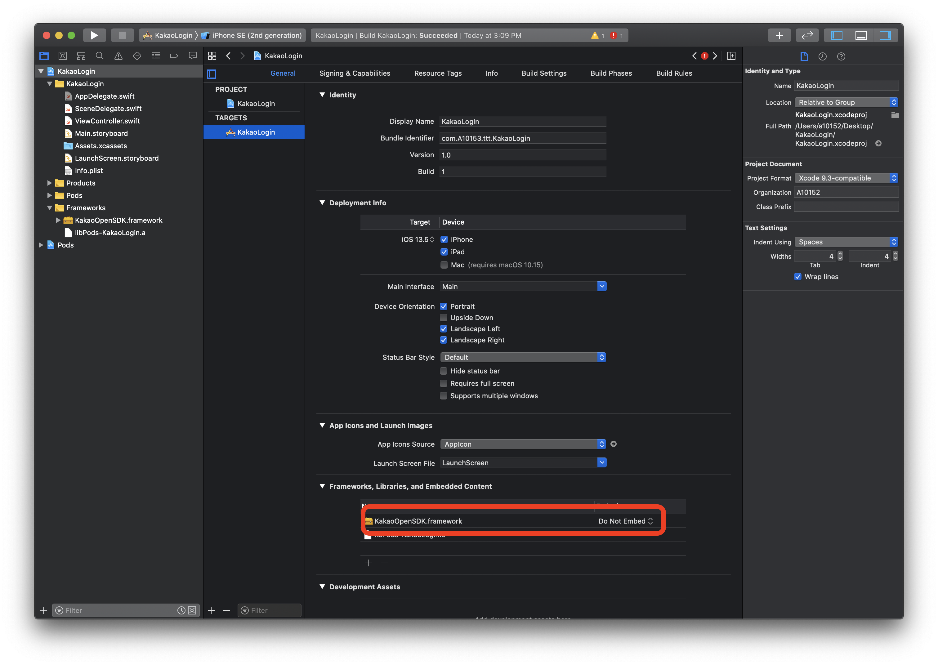 3) 앱에 로그인 관련 프레임워크 import (Frameworks 그룹에 드래그앤드롭)