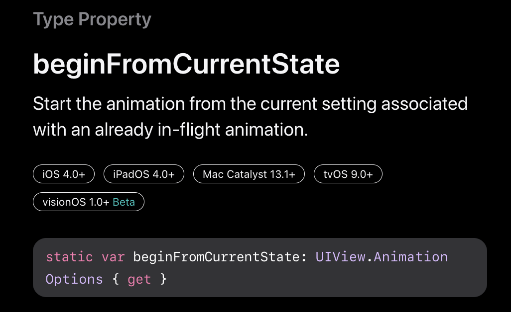 - UIView.animate로 애니메이션을 줄 때, 현재 애니메이션이 진행되는게 있으면 그것에 이어서 적용되도록 하는 옵션