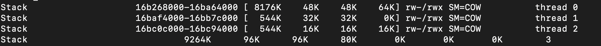 - 스레드 0의 스택 영역의 크기는 56MB이며 주소 범위는 0x16b268000 ~ 0x16ba64000