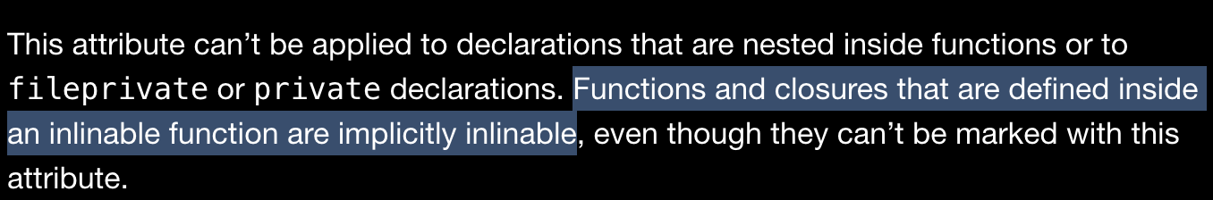 - @inlinable 함수안에서 정의된 함수나 클로저는 암묵적으로 @inlinable로 적용