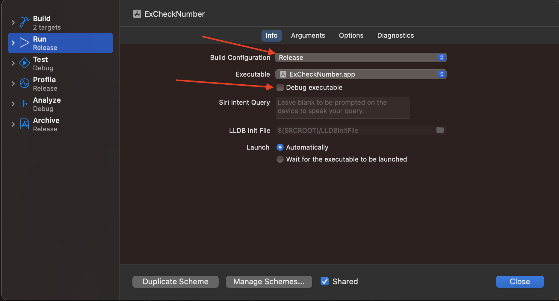 - Xcode > Edit Scheme > Build Configuration을 Release로 설정 > Debug excutable 체크 해제