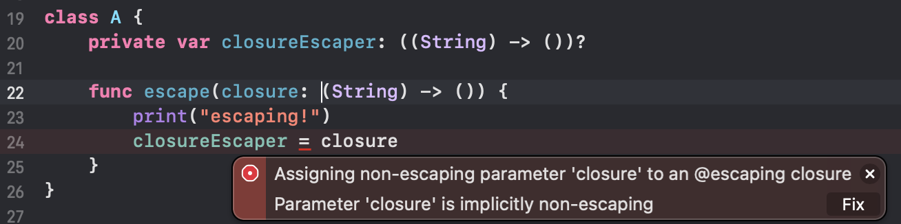 ex3) 또 다른 delay의 의미로 property에 저장하는 경우에서도 역시 @escaping 을 붙이지 않으면 에러
