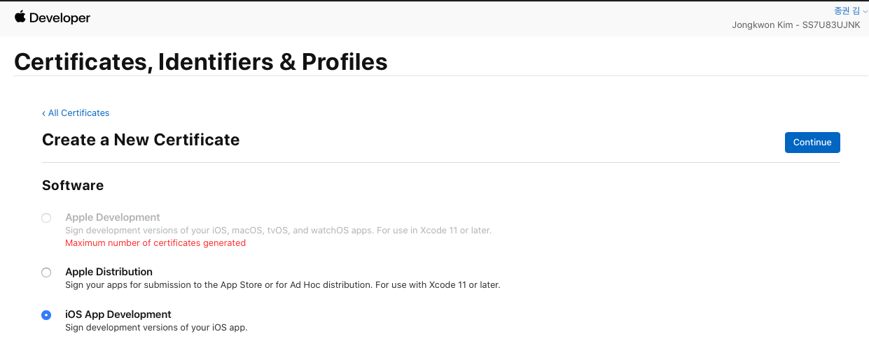 - Apple Development용 certificate생성 (체크 후 Continue버튼 클릭)
