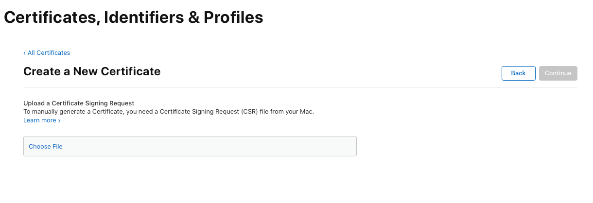 - "키체인 접근"앱에서 만든 Certificates 파일 (CSR파일) 업로드 후 Continue