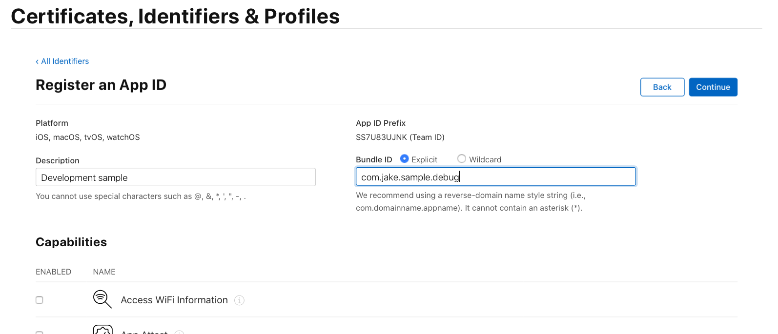 - Apple Developer사이트에서 App Identifiers 입력