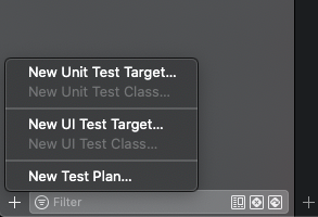 - Unit Test target생성: 하단에 '+' 버튼 클릭 -> New Unit Test Target 클릭