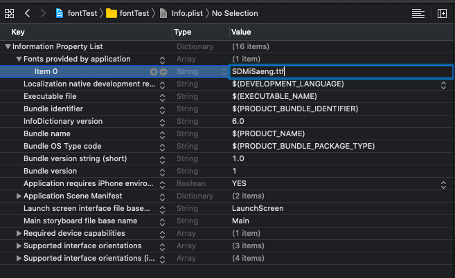2) info.plist파일에서 "Fonts provided by application"추가 후, 하위항목을 추가한 후 폰트 파일의 이름 입력