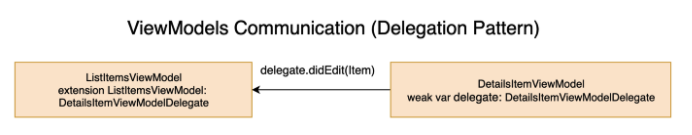 // Step 1: Define delegate and add it to first ViewModel as weak property