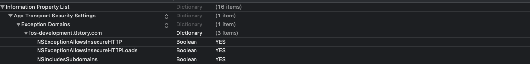 (1)App Transport Security Settings -> Exception Domains 하위 항목에 아이템 생성 후 Dictionary로 설정
