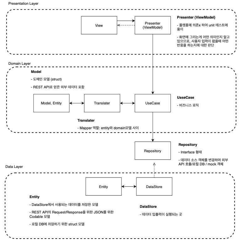- 잘 변하지 않는 계층인 Domain계층으로 Presentation과 Data 계층이 의존하는 형태