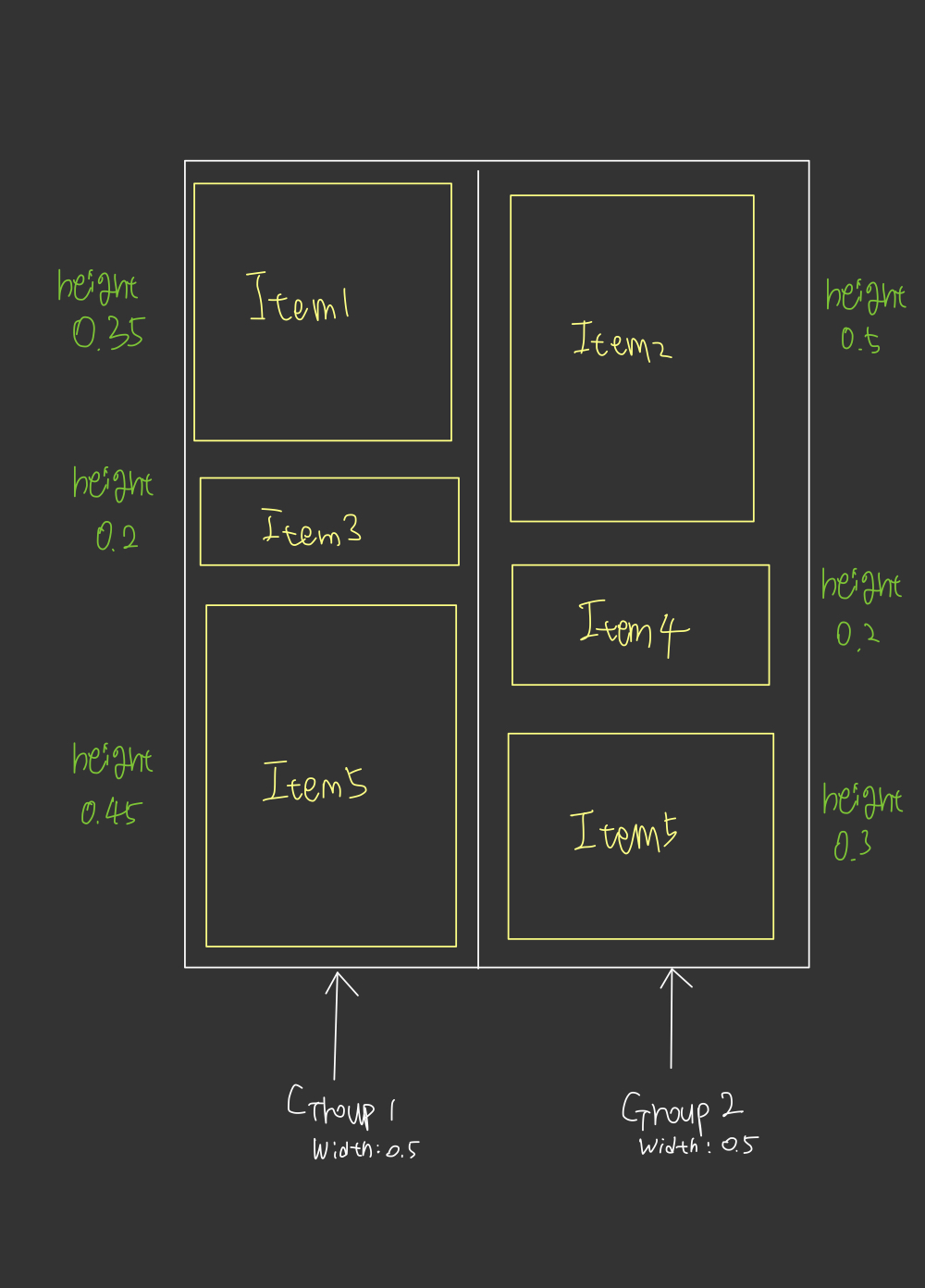 - item의 fraction height값이 모두 다르므로, item 6개 모두 생성하고 각 fraction height값은 위와 같이 각 group에 속하는 item fraction height 합이 1이 되도록 설계