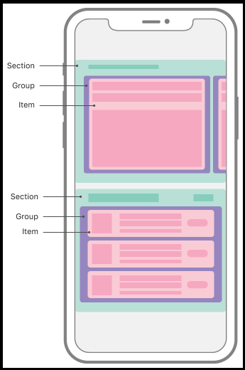 - collectionView의 레이아웃을 이루는 객체들 Item, Group, Section에 각각 레이아웃정보를 주고, 그 객체들을 합쳐서 구성