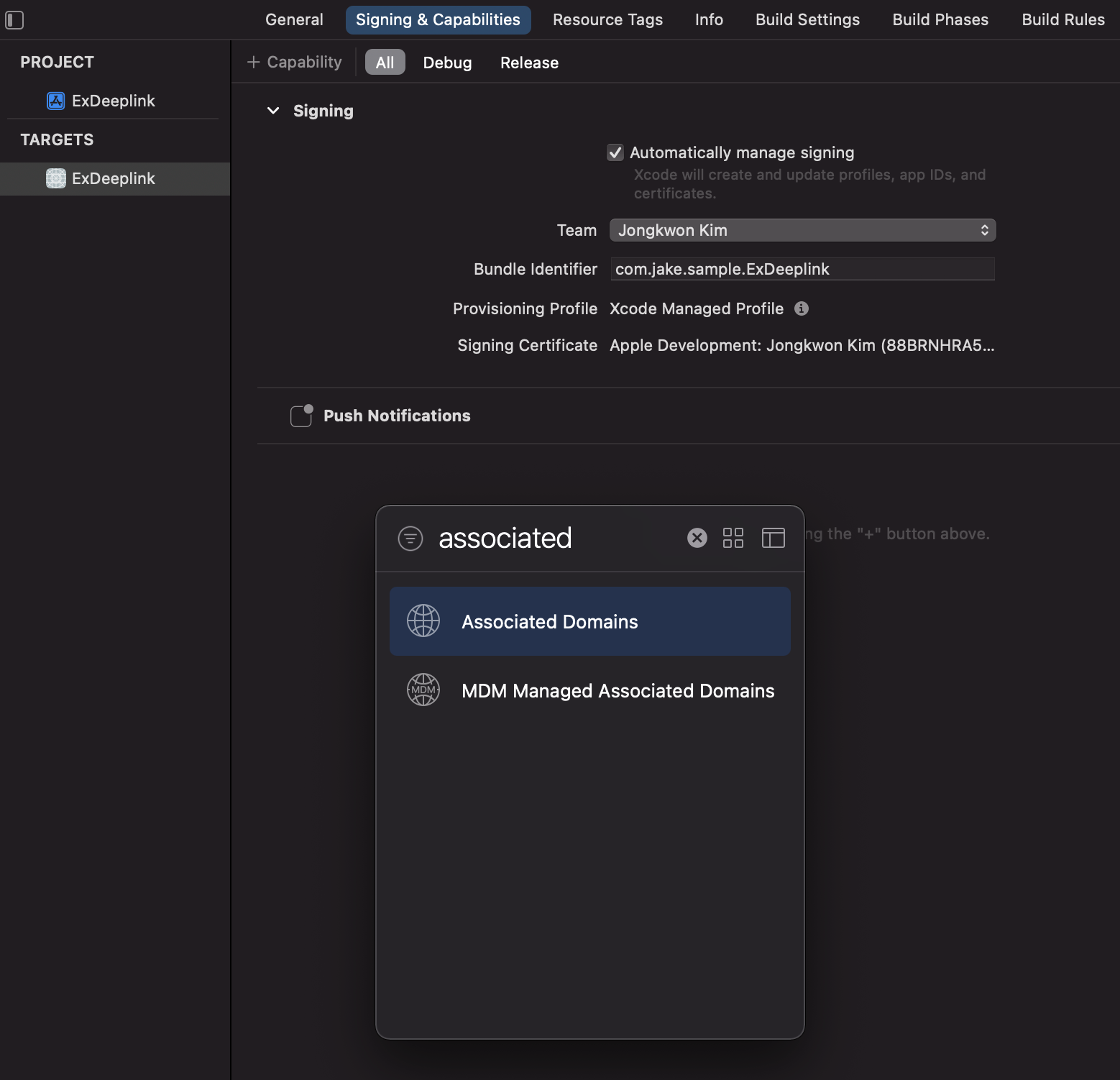 - 링크를 여는 데 사용할 앱 번들 ID를 "com.jake.sample.ExDeeplink"로 선언