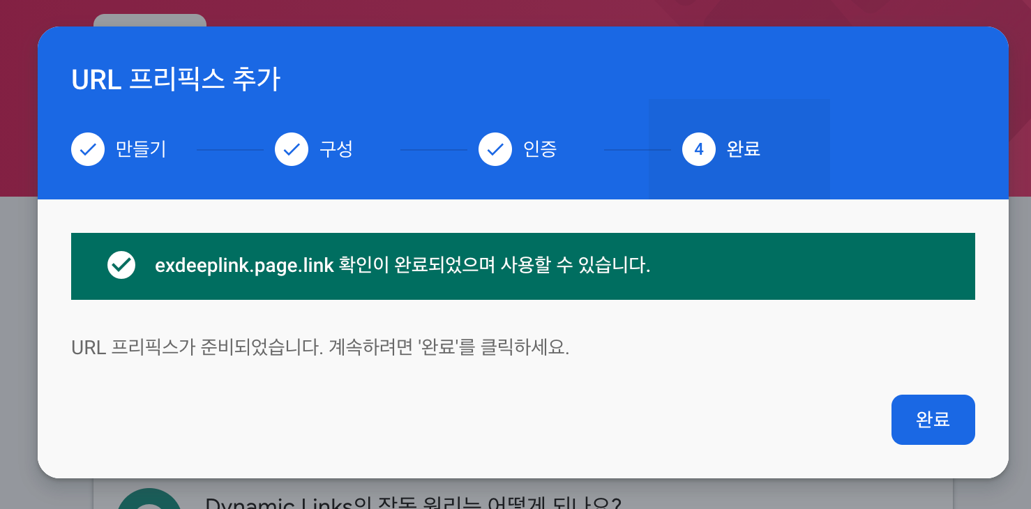 - Firebase 콘솔 접속 > Dynamic Links 탭 > 시작하기