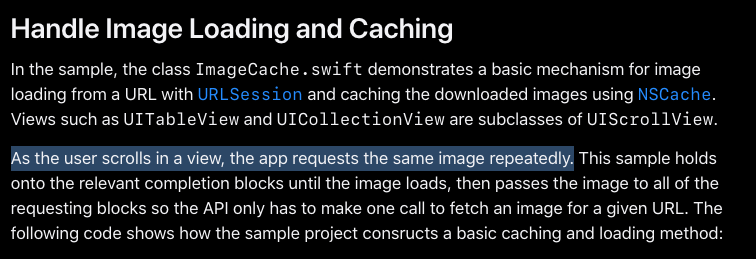 - TableView, CollectionView에서 사용자가 뷰를 스크롤 시 같은 이미지를 요청하는 경우가 생기고, 이때 cache를 통해서 이미지에 해당하는 URL은 API를 한 번만 호출하도록 하기 위함