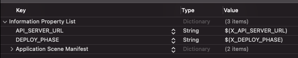 1) .swift파일 코드에서 현재 phase에 해당하는 값을 가져오고 싶은 경우, info.plist에서 값을 가져올 수 있고 info.plist에서는 정의한 xcconfig의 내용에 접근할 수 있으므로 info.plist에 xcconfig 내용 매핑