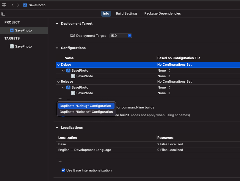 - 만들어진 .xcconfig 파일을 Xcode Configurations에 설정