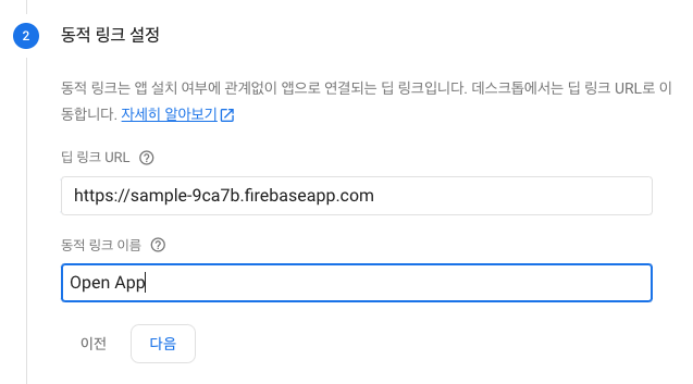 - [동적 링크 설정] 딥 링크 URL은 prefix를 "https://"로하여, 위 링크를 붙여넣기