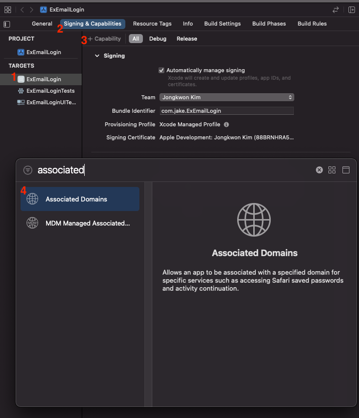 - Xcode > Target > Signing & Capabilities > + Capability > Associated Domains 생성