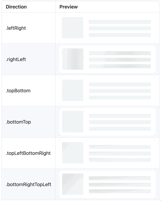 let skeletonAnimation = SkeletonAnimationBuilder().makeSlidingAnimation(withDirection: .leftRight) self.view.showAnimatedGradientSkeleton(usingGradient: .init(colors: [.lightGray, .gray]), animation: skeletonAnimation, transition: .none) DispatchQueue.main.asyncAfter(deadline: .now() + 3) { self.view.hideSkeleton() }