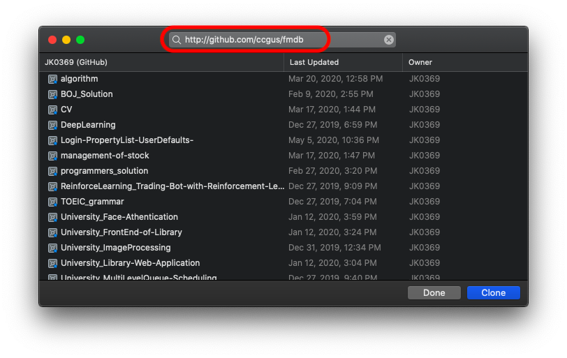 2) xcode에서 git hub주소를 이용해서 FMDB라이브러리 파일 다운