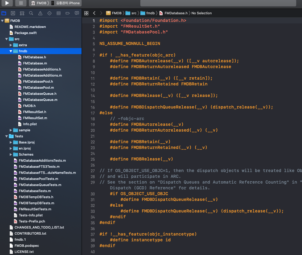 - FMDatabase : 하나의 SQLite 데이터베이스를 나타내는 객체 (SQL문 실행할 때 사용)