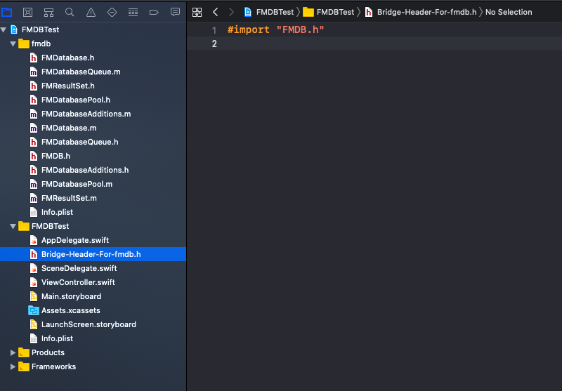 4) fmdb는 오브젝트-c로 작성되어 있으므로 브리지 헤더 추가, 임포트