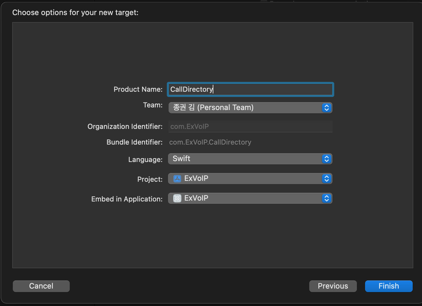 - Call Directory Extension의 번들 ID 확인: "com.ExVoIP.CallDirectory"